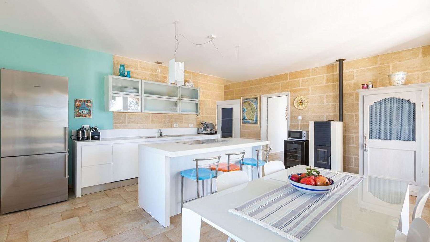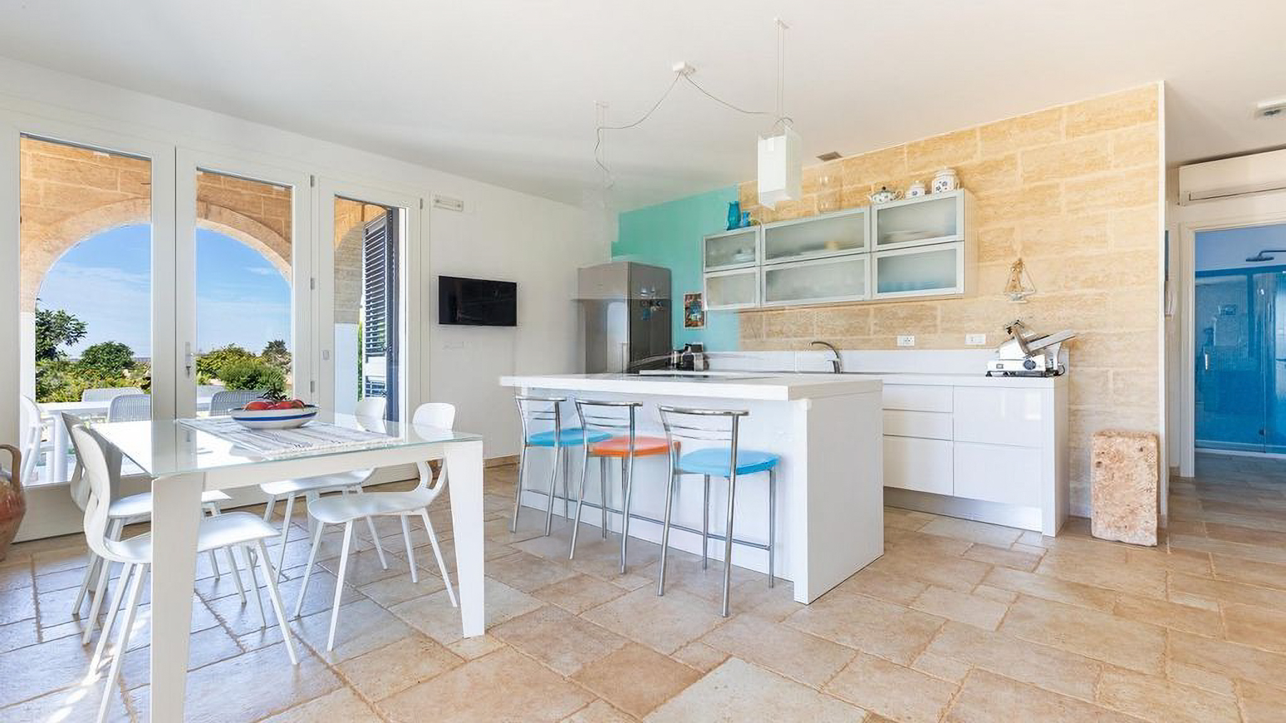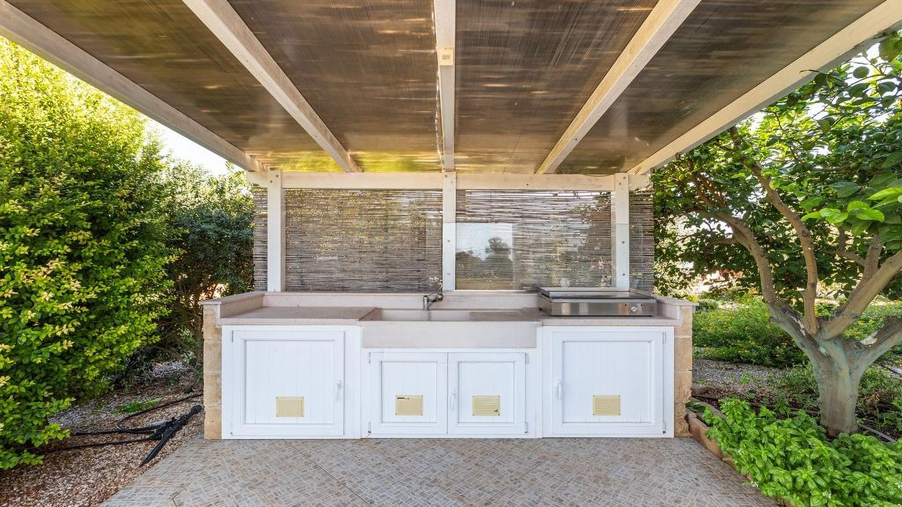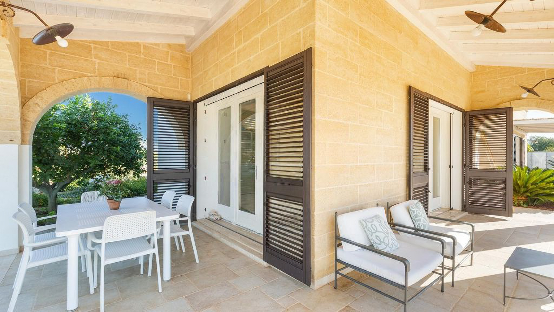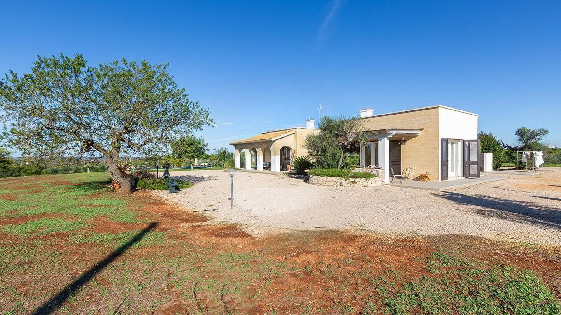 Immersa in un rigoglioso giardino di 11.000 mq completamente recintato da muretti in pietra a secco, questa proprietà ospita anche un Lamione di 55 mq da ristrutturare. La villa, arricchita da rivestimenti in pietra viva tipici del Salento, è magnificamente illuminata dal sole in tutte le stagioni, grazie alle ampie e luminose vetrate che affacciano sul giardino con incantevole vista mare. Interamente sviluppata al piano terra, la villa ospita 3 camere da letto, 2 bagni, 2 ripostigli, un ampio living con zona relax e una grande cucina moderna dotata di isola centrale in marmo. Da qui, la vista corre sulla splendida piscina a sfioro vista mare di 40 mq, che domina questo scenario da favola. Grazie a un progetto appositamente realizzato che ha incluso un uso sapiente di mobili e colori, gli ambienti interni si rispecchiano perfettamente in quelli esterni, creando una perfetta armonia. Esternamente, la proprietà offre ampi spazi attrezzati che consentono di scegliere dove trascorrere momenti di tranquillità, immersi nella quiete del giardino. Tra questi, degni di nota sono le zone delle terrazze: un grande porticato ombreggiato con bamboo e un porticato angolare dotato di tegole, ideali per piacevoli rinfreschi al calar del sole. Il giardino, arricchito da arbusti mediterranei, alberi ad alto fusto, erbe aromatiche, un agrumeto, un piccolo vigneto e 100 ulivi di recente piantumazione, ospita anche una meravigliosa zona piscina, dedicata al benessere esclusivo, con prato inglese, area solarium attrezzata, zona ombreggiata e una cucina esterna con griglia. La piscina è predisposta per l'inserimento di un chiller, permettendo l'uso anche nei periodi più miti. Per ospitare amici e familiari, il Lamione può essere ristrutturato e adibito a dependance. La proprietà, allacciata alla rete idrica pubblica, vanta un impianto fotovoltaico da 6.5 kW, pannelli solari per la produzione di acqua calda sanitaria, un pozzo artesiano, impianto di fitodepurazione, impianto di irrigazione automatizzato e illuminazione esterna. La sicurezza è garantita da un impianto d'allarme, videosorveglianza con telecamere, un cancello automatico principale e uno secondario.