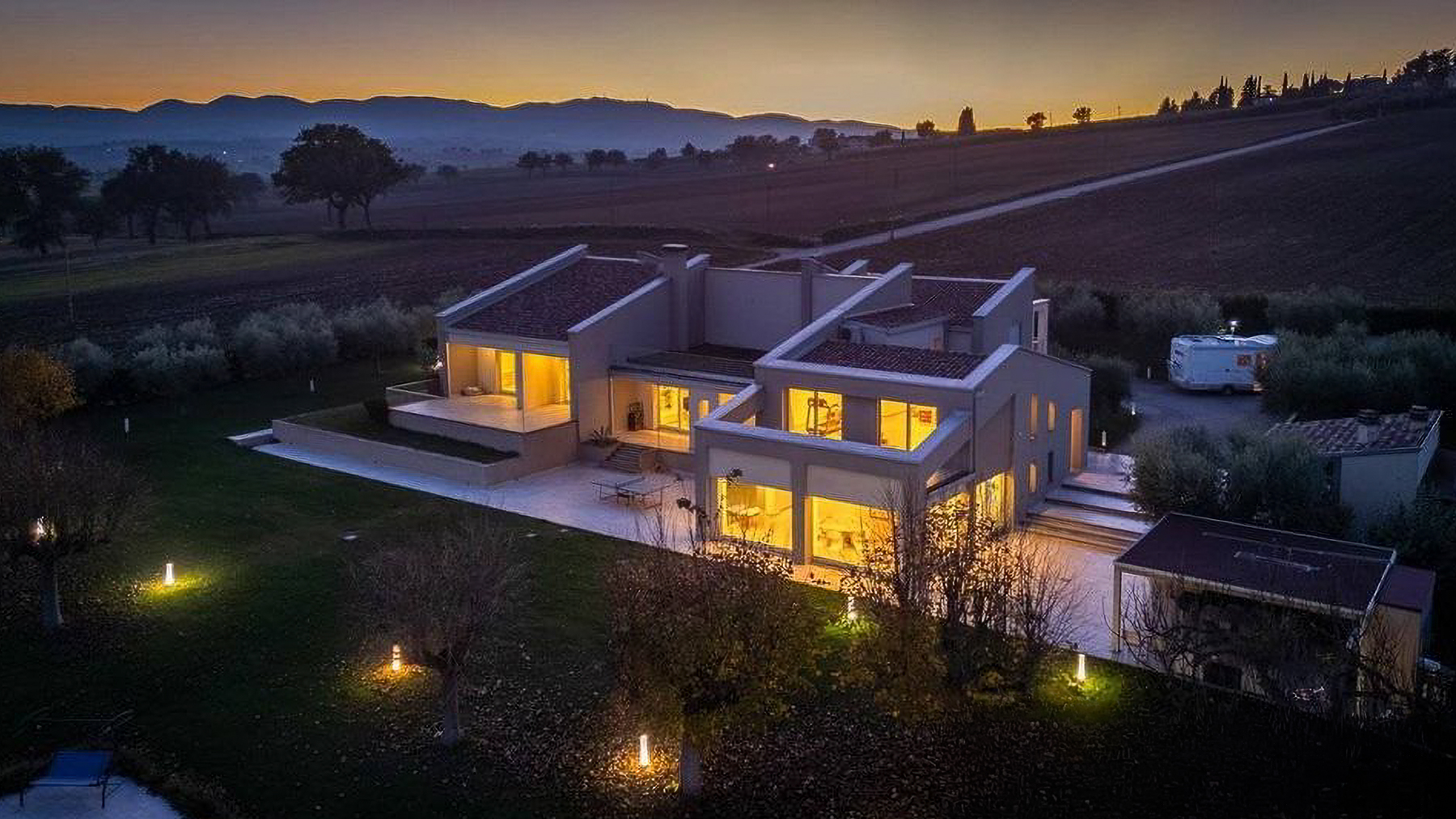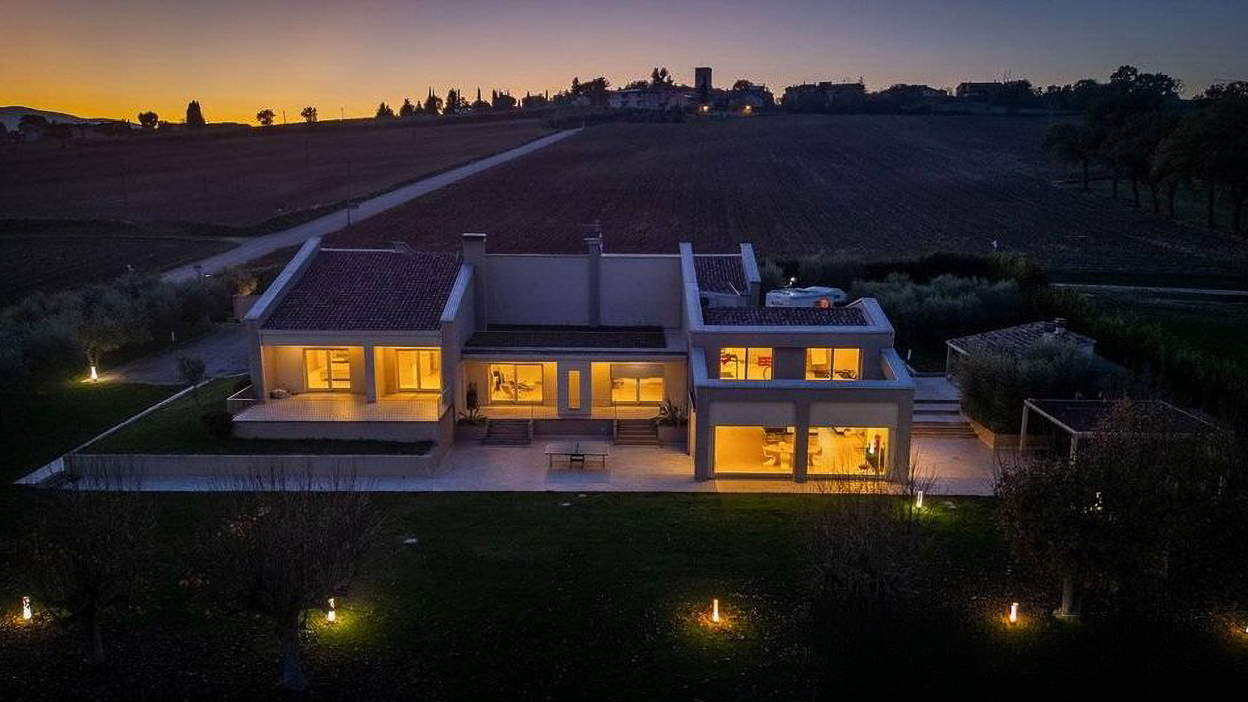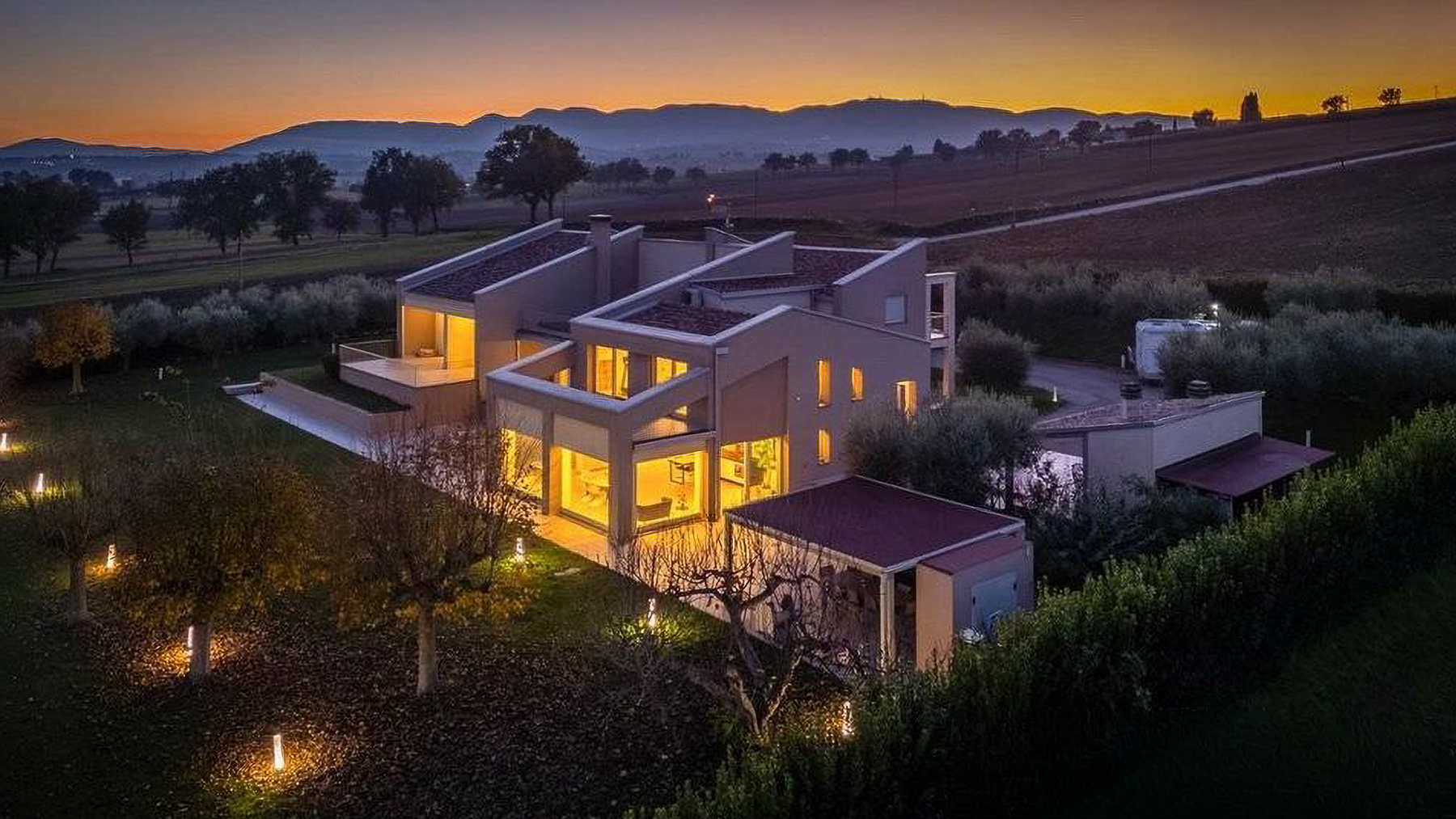 Immersa nel cuore delle colline umbre, tra i profumi delle vigne e il verde degli uliveti, questa villa contemporanea è un rifugio di lusso e tranquillità. Al calar della sera, la casa s'illumina di una luce calda e accogliente, mentre il panorama circostante si tinge dei colori del tramonto, creando un'atmosfera magica che invita a rilassarsi e sognare. Con una superficie complessiva di 622 mq, la villa si sviluppa su due livelli che ospitano 12 stanze, di cui 3 bagni, e spazi ampi e luminosi grazie alle grandi superfici vetrate. Situata tra Montefalco e Trevi, in provincia di Perugia, la proprietà abbraccia il paesaggio collinare con i suoi terrazzi e portici panoramici. Gli interni, caratterizzati da finiture di pregio e dettagli su misura, offrono un comfort abitativo d'eccellenza. Vivere in questa villa significa godere di un lifestyle esclusivo, dove ogni giorno si trasforma in un'esperienza unica. Immagina di svegliarti con la luce del sole che filtra dalle vetrate, gustare una colazione all'aperto con vista sulle colline, o trascorrere pomeriggi estivi a bordo piscina, circondato dalla natura. Ogni angolo della casa è pensato per celebrare la bellezza del paesaggio e la qualità della vita. Questa residenza rappresenta un'opportunità irripetibile nel panorama immobiliare di lusso, un perfetto equilibrio tra eleganza moderna e comfort senza compromessi. Un luogo dove vivere in armonia con la natura, senza rinunciare a nessun comfort.