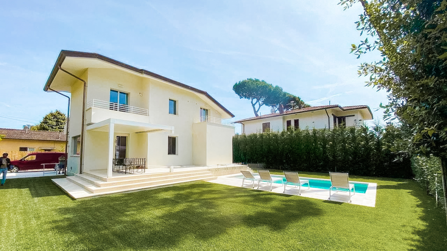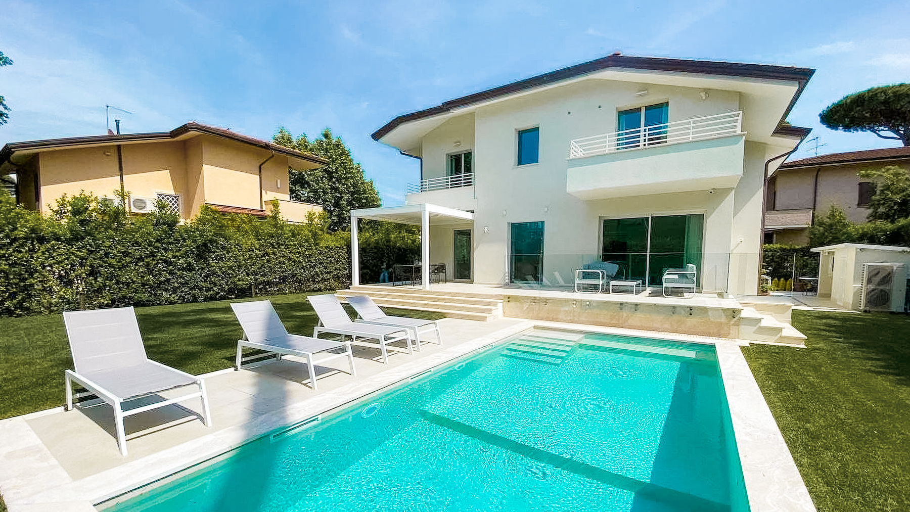 Nascosta tra le meraviglie della Versilia, questa villa a Marina di Pietrasanta incanta i sensi con la sua eleganza e la perfetta armonia con il contesto naturale. Lasciati avvolgere dalla luce calda del sole che attraversa le ampie vetrate, mentre il profumo del mare e il canto degli uccelli creano un'atmosfera di serenità e lusso. Con una superficie di 180 mq, questa splendida proprietà offre sei stanze e cinque bagni, distribuiti su due piani, in un contesto spazioso e confortevole. Il giardino privato di 1290 mq, impreziosito da una piscina scintillante e una veranda attrezzata, rappresenta il cuore pulsante della villa, ideale per momenti di puro relax. La zona giorno, con un ampio soggiorno e una cucina all'americana di design moderno, si apre verso l'esterno, creando un continuum tra spazi interni ed esterni. Al piano superiore, le suite matrimoniali con bagni privati e balconi offrono un rifugio di pace con vista sul rigoglioso giardino. Vivere in questa villa significa abbracciare uno stile di vita raffinato e rilassante. Immagina le giornate estive trascorse a bordo piscina, o le serate a cena sotto il cielo stellato, accompagnate dal suono delle onde che si infrangono in lontananza. Ogni momento qui è un'opportunità per godere della bellezza del luogo. Questa proprietà rappresenta un'opportunità irripetibile nel mondo degli immobili di lusso. Una residenza che coniuga eleganza senza tempo e comfort moderno, pronta ad accogliere chi cerca un rifugio esclusivo nella splendida cornice della Versilia.