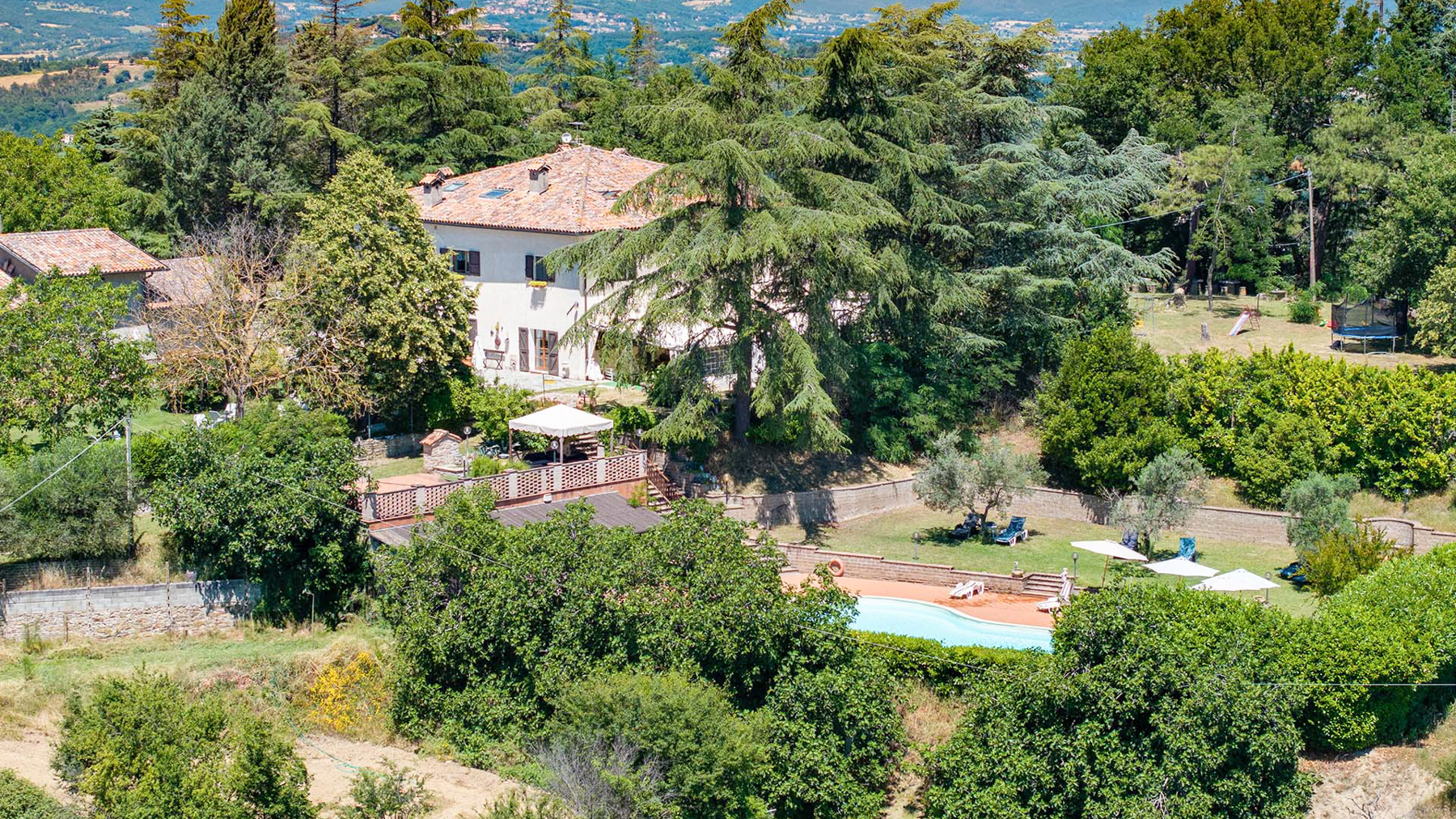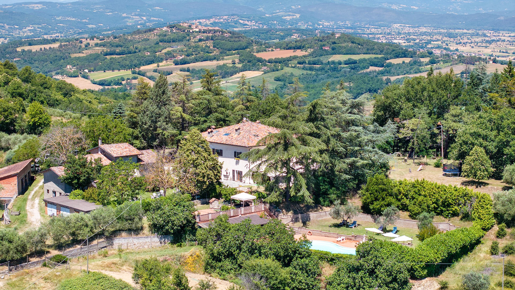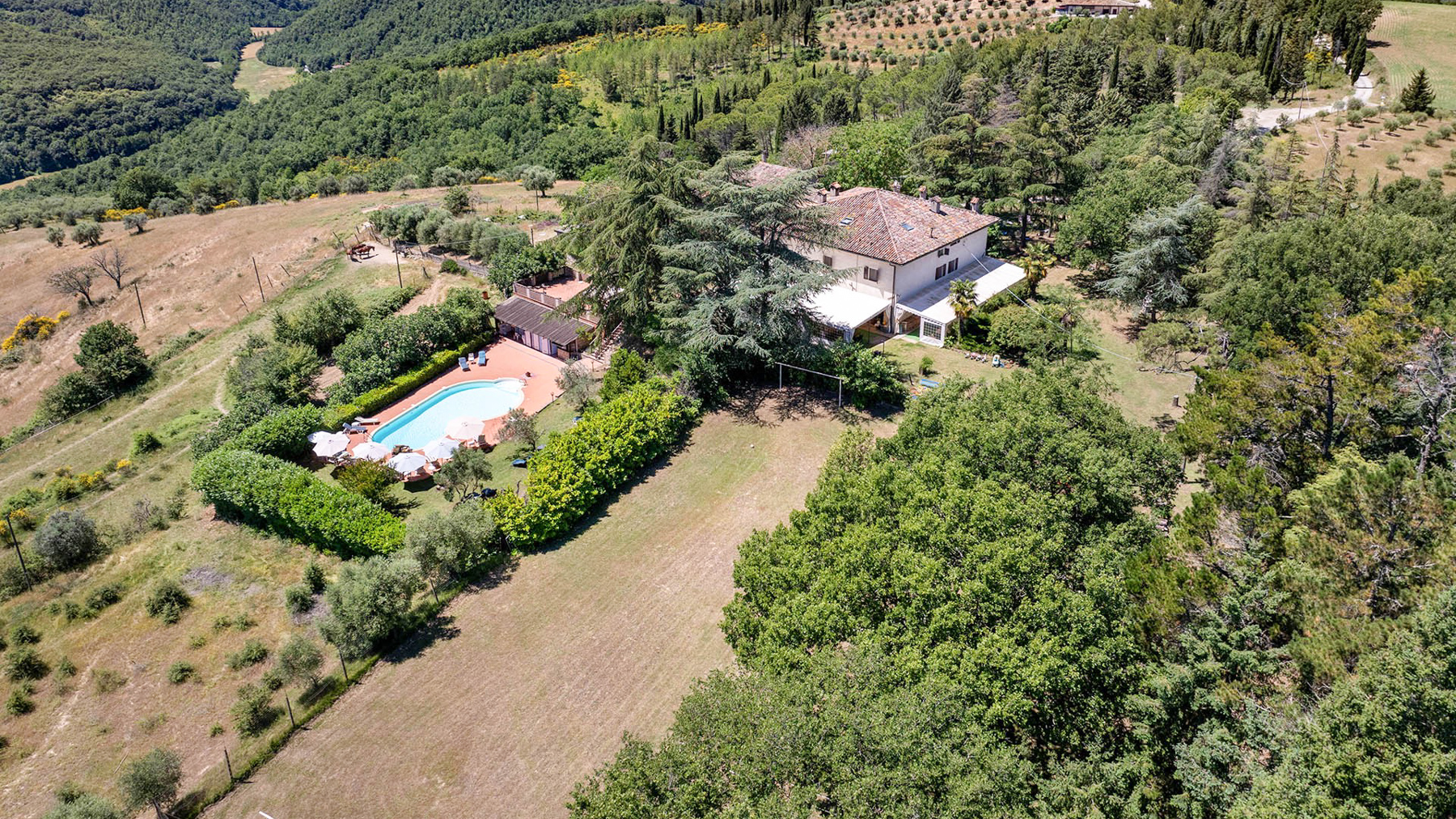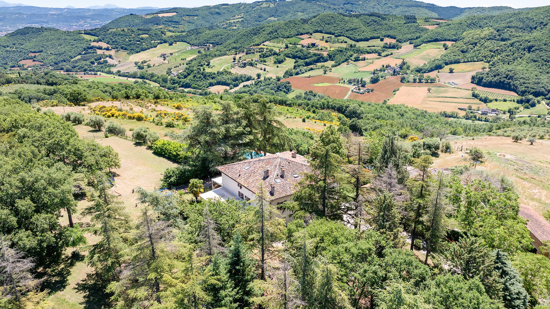 Incastonata tra le dolci colline umbre, al confine con la Toscana, questa magnifica proprietà offre un rifugio di pace e bellezza. Qui, il sole sorge dipingendo il cielo di colori caldi e tramonta regalando spettacoli mozzafiato, mentre l'aria fresca porta il profumo della natura circostante. Un angolo di paradiso dove ogni giorno inizia con una vista incantevole sui colli che abbracciano la casa. La proprietà si estende per 750 mq e comprende un casale principale in pietra e una dependance, per un totale di 15 stanze e 10 bagni. Al piano terra, spazi accoglienti e autentici raccontano la storia di un tempo passato, con pavimenti e pareti originali del 1850 e un grande forno a legna. Al primo piano, le cinque camere da letto con bagno en suite offrono comfort e riservatezza. Il piano mansardato accoglie i pellegrini con stanze multiple e una cucina dedicata. La dependance ospita un appartamento indipendente, perfetto per ricevere ospiti o per una famiglia numerosa. All'esterno, la piscina di acqua salata si affaccia su un panorama senza eguali, circondata da un giardino di 5000 mq e da 6,5 ettari di terreno tra seminativo, vigna e olivi, dove cavalli pascolano liberi. Vivere qui significa abbracciare uno stile di vita autentico, dove il tempo sembra rallentare. Immagina di passeggiare tra i campi al tramonto, di organizzare cene sotto un cielo stellato nel giardino fiorito, o di rilassarti a bordo piscina nelle calde giornate estive, avvolto da un panorama che nutre l'anima. Questa proprietà unica nel suo genere rappresenta un'opportunità irripetibile per chi cerca l'equilibrio perfetto tra eleganza senza tempo e comfort moderno, un gioiello raro nel cuore della campagna umbra.