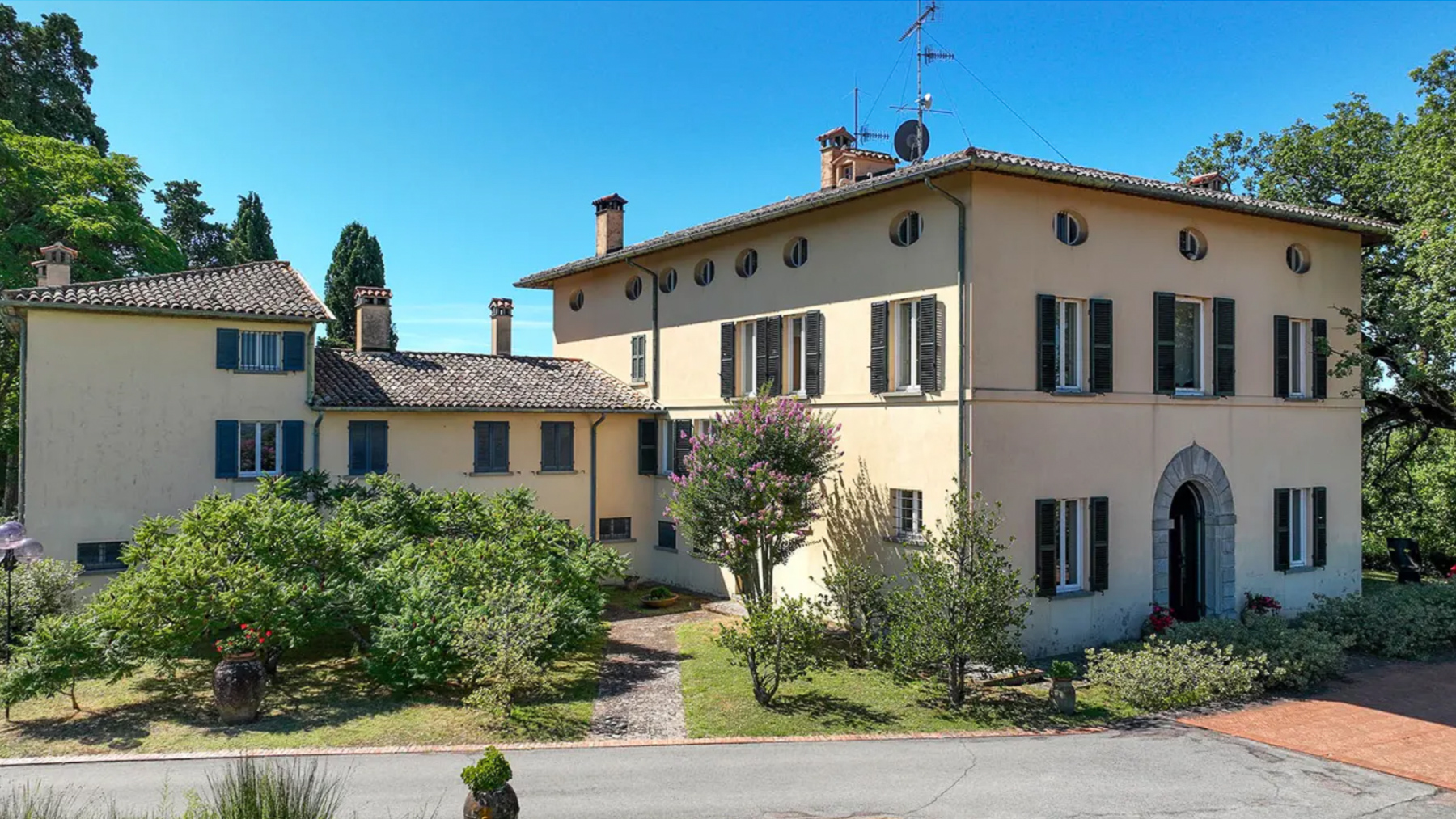 Immersa nel cuore di una verdeggiante collina, questa magnifica villa storica è un'oasi di tranquillità e lusso, avvolta dal silenzio della natura e a breve distanza dal vibrante centro storico di Città di Castello. Qui, l'aria fresca e il canto degli uccelli ti accolgono ogni giorno, mentre il sole filtra tra le fronde degli alberi secolari, creando giochi di luce che danzano sui prati. Questa straordinaria proprietà si estende su 1.290 mq, suddivisa in 30 stanze e 15 bagni, offrendo ampi spazi per vivere e ricevere ospiti. La villa principale, con le sue pareti ornate in stucco veneziano e foglia d'oro, conserva il fascino di un antico monastero del 1600, arricchita da un prezioso pavimento a mosaico romano. Completano l'offerta una piscina riscaldata, una palestra, una dependance del XVIII secolo e una casa del custode, il tutto circondato da un parco di 2 ettari che può essere ulteriormente ampliato. Immagina di trascorrere le tue giornate passeggiando tra i giardini curati, dove il profumo delle rose e delle erbe aromatiche riempie l'aria. Goditi serate estive nella piscina illuminata, o cene all'aperto sotto le stelle, con il fruscio delle foglie come sottofondo e il cielo stellato a fare da cornice. Questa villa rappresenta il perfetto equilibrio tra eleganza senza tempo e comfort moderno, un'opportunità unica nel panorama immobiliare di lusso. Un luogo dove storia e innovazione si fondono per creare un rifugio esclusivo e raffinato.