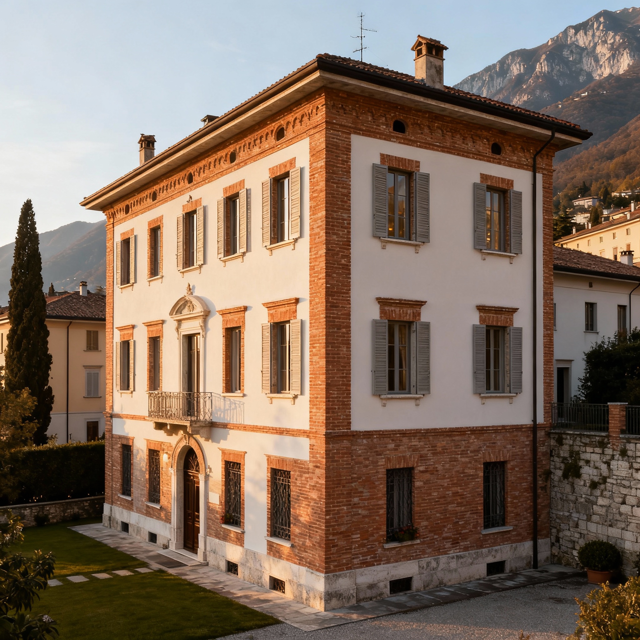 Villa di lusso con mattoni rossi affacciata su un lago lombardo, immersa in un paesaggio sereno e suggestivo.
