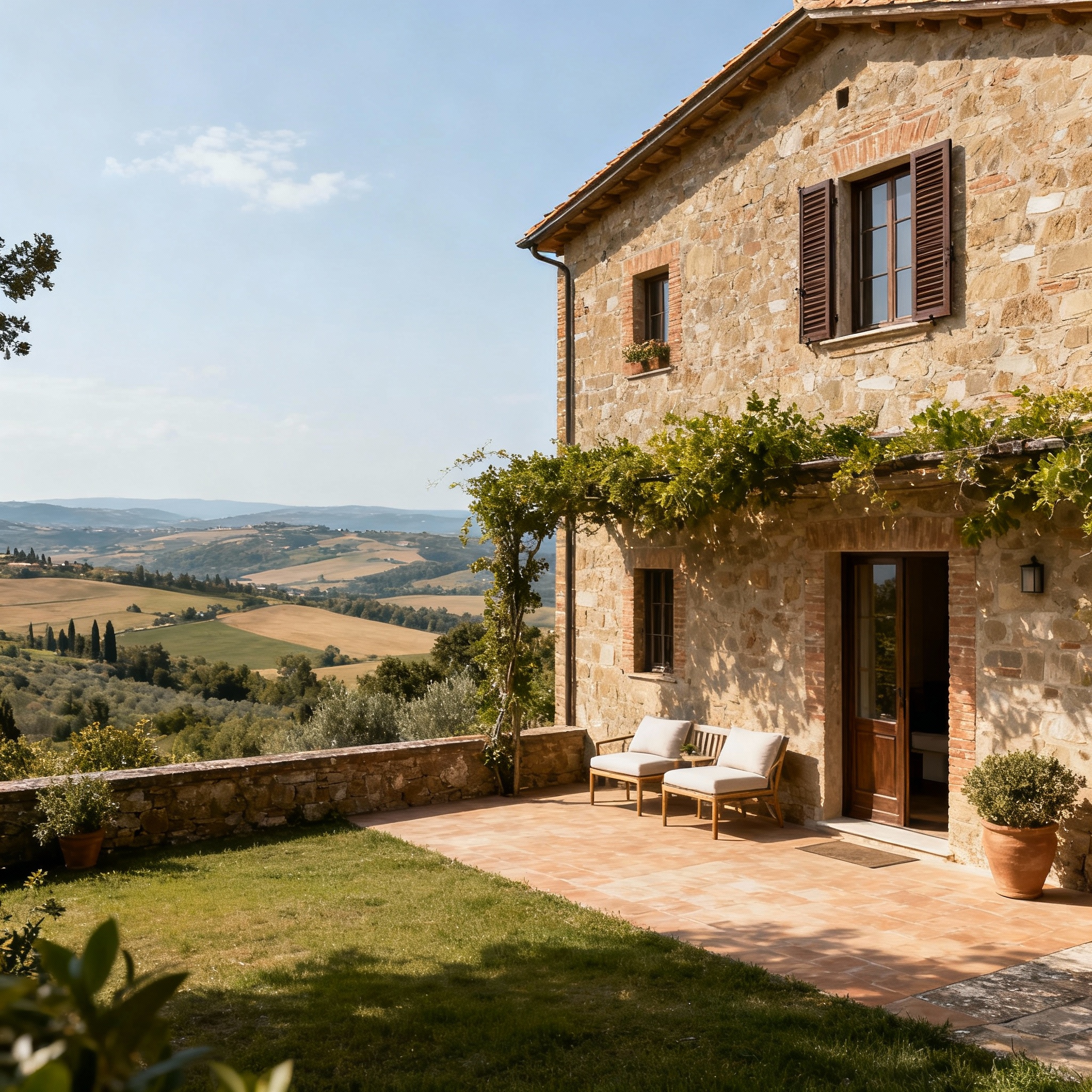 Elegante appartamento tra colline marchigiane, vista panoramica su borgo storico, illuminato dalla luce del mattino.