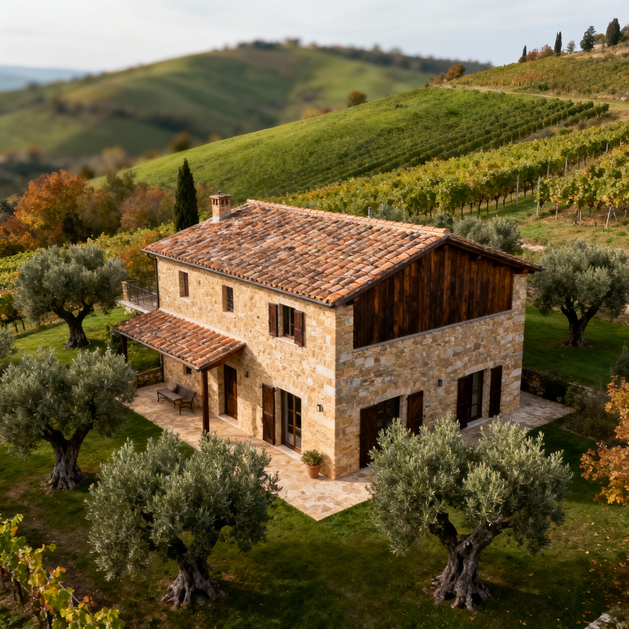 Rustico piemontese in pietra immerso nelle colline vinicole, circondato da un paesaggio autunnale e alberi secolari.Rustico piemontese in pietra immerso nelle colline vinicole, circondato da un paesaggio autunnale e alberi secolari.